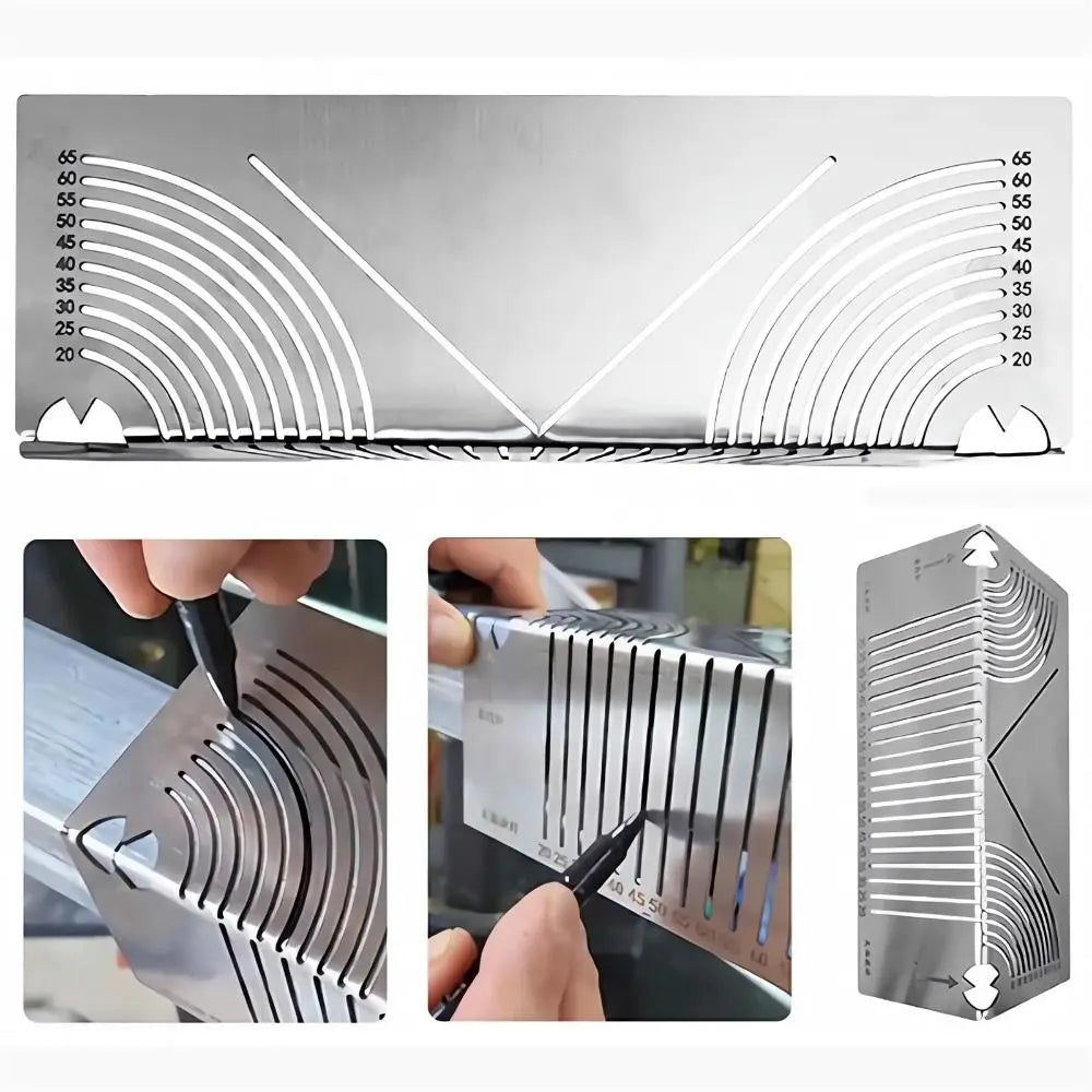 Dens unikke design integrerer flere tegnevinkler samt en buet kant, der muliggør præcise markeringer selv på uregelmæssige stykker.