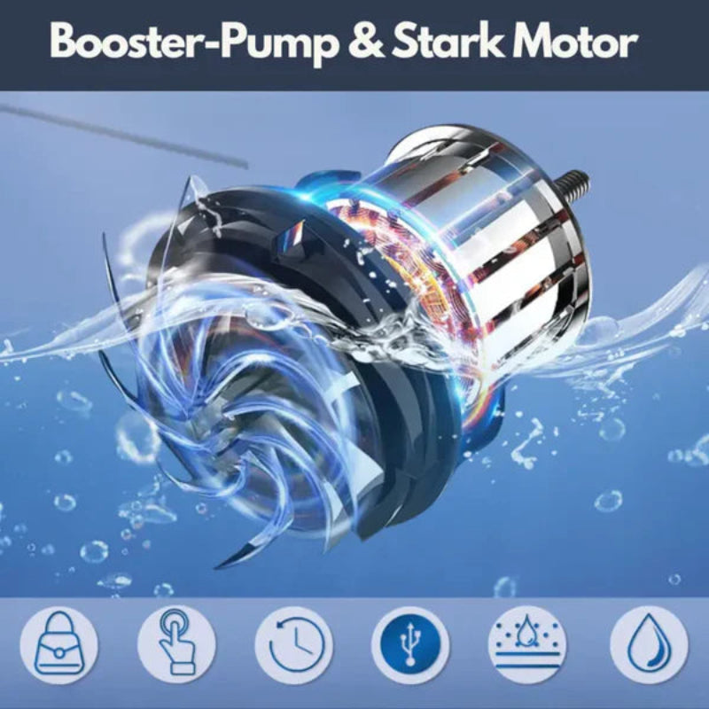 Deze draagbare douche is uitgerust met een oplaadbare batterij en kan werken zonder elektriciteit zodra deze is opgeladen.